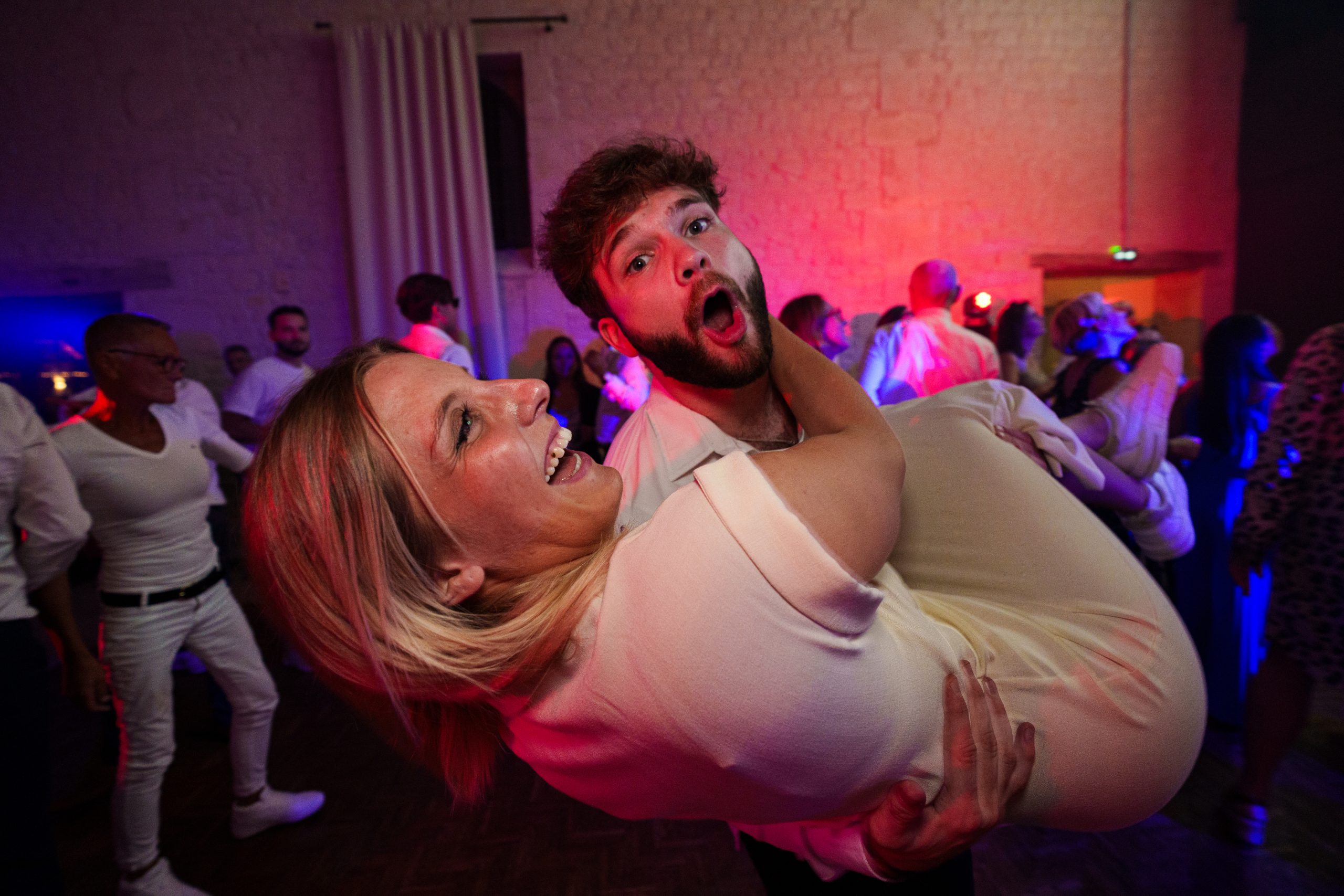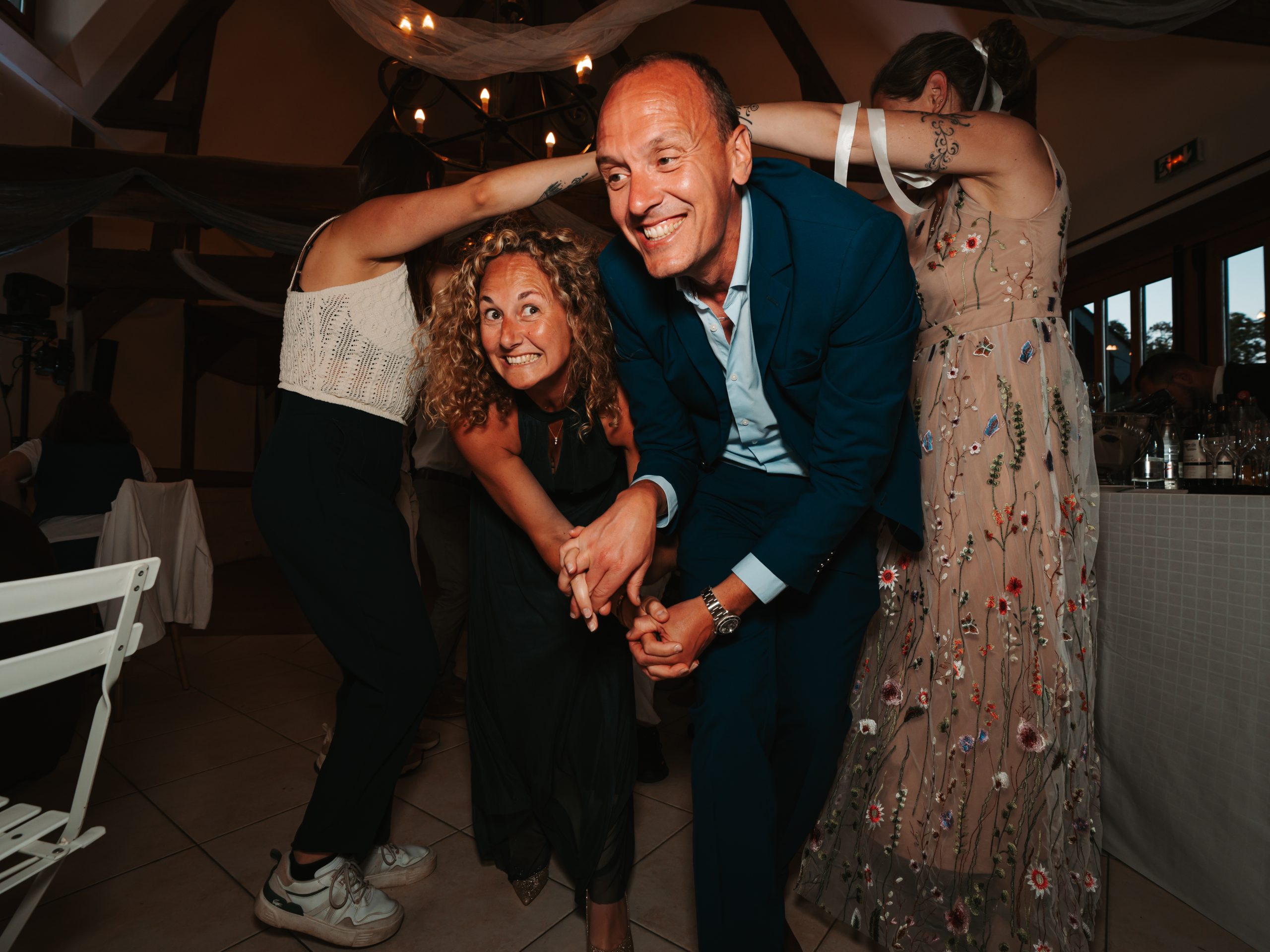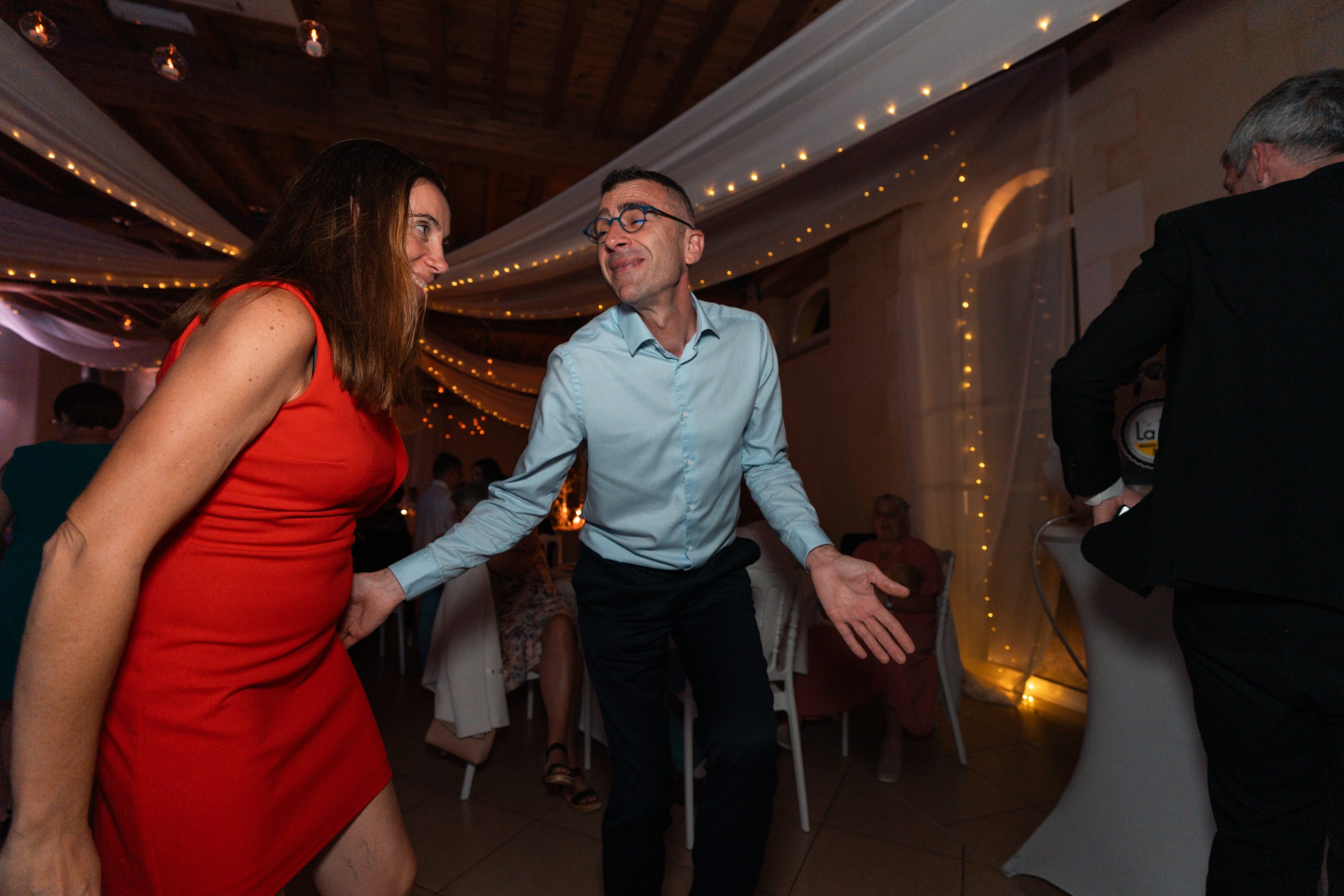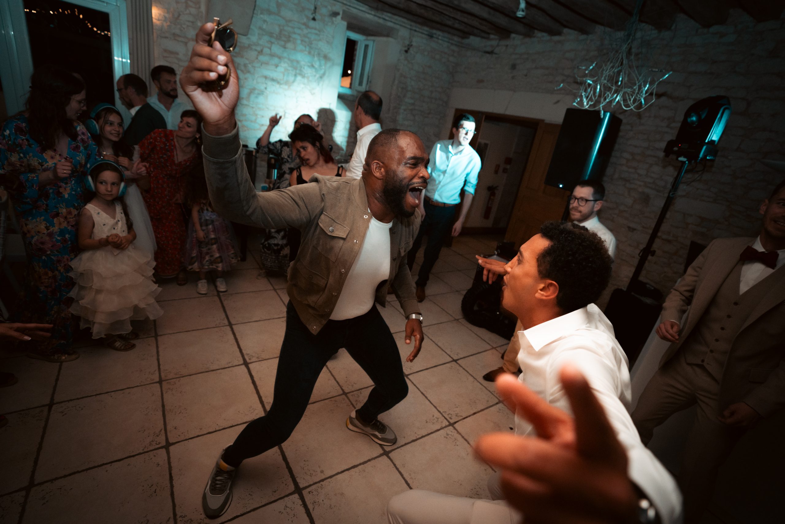 Dernière étape de cette journée bien remplie. La plupart des animations se passeront pendant le repas donc pas de repos pour le photographe. Les festivités continues et c’est le moment d’enflammer le dancefloor. Un bon dj qui saura jouer avec les lumières sans abuser de la fumée (j’insiste), c’est la garantie d’une ambiance lumineuse qui se ressentira tout de suite. Mes photos de soirées se veulent immersives. Je veux reproduire l’ambiance que vous vivez à cet instant précis.